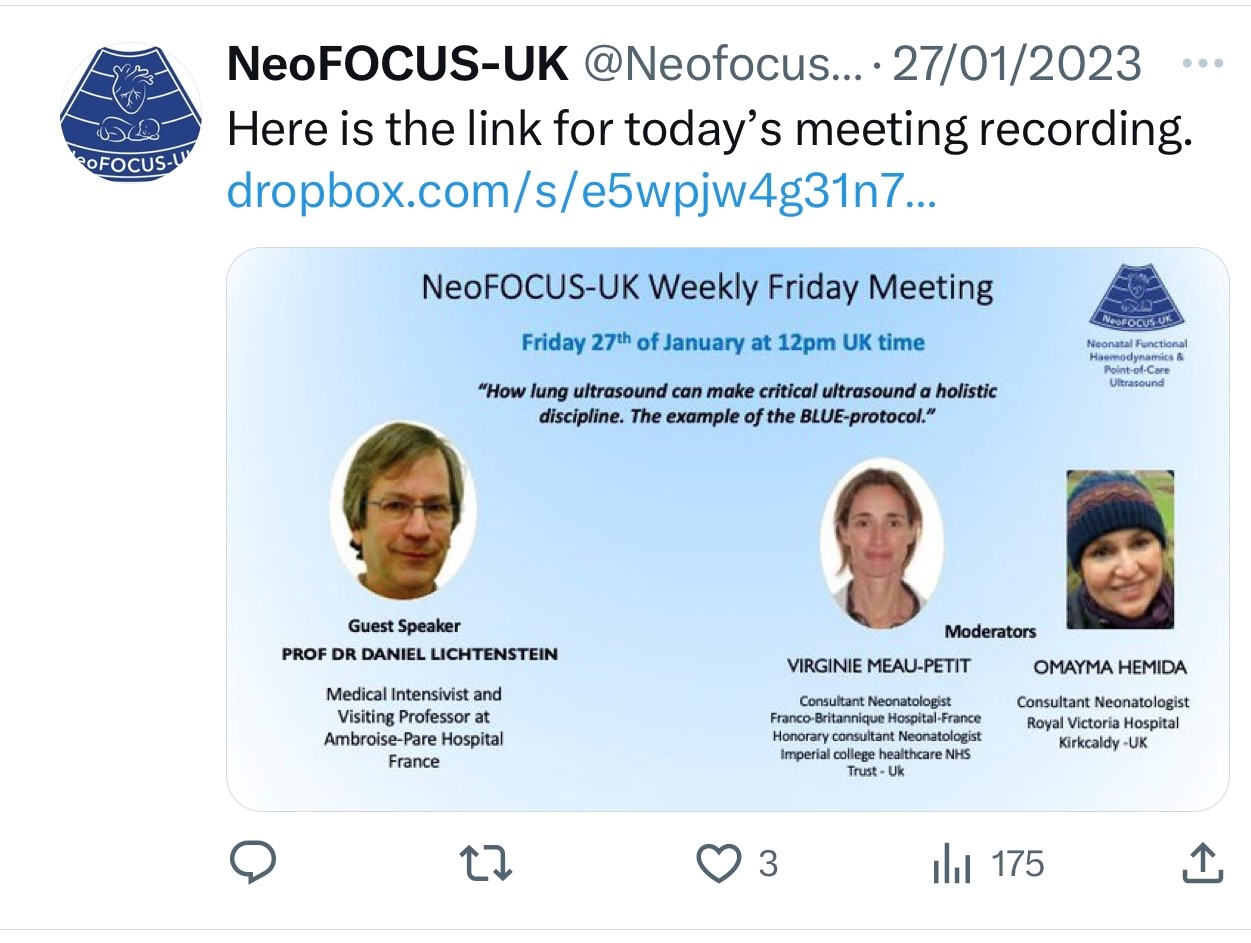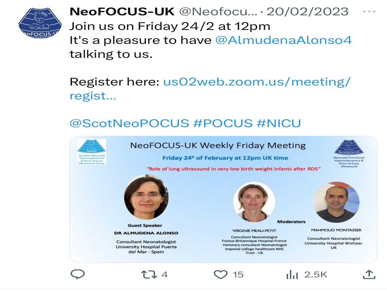-CPD & Peer Review: We host weekly online educational meetings attended by neonatal trainees, consultants, and international collaborators. These sessions include expert presentations, case discussions, and challenging cases where POCUS was helpful to guide bedside management